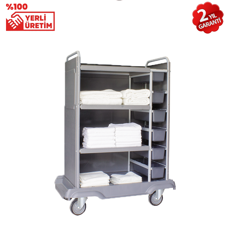 OTEL KAT TEMİZLİK ARABASI(KAPAKSIZ)Çekmece:6*10 ltGövde: Paslanmaz Boyalı GövdeBoyut:1160*610*1480 mmTekerlekler:4*150 mm (çift rulmanlı)