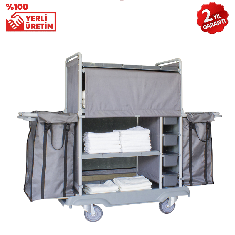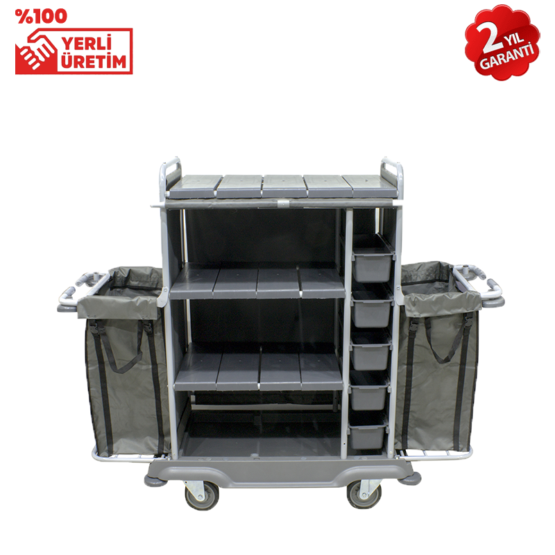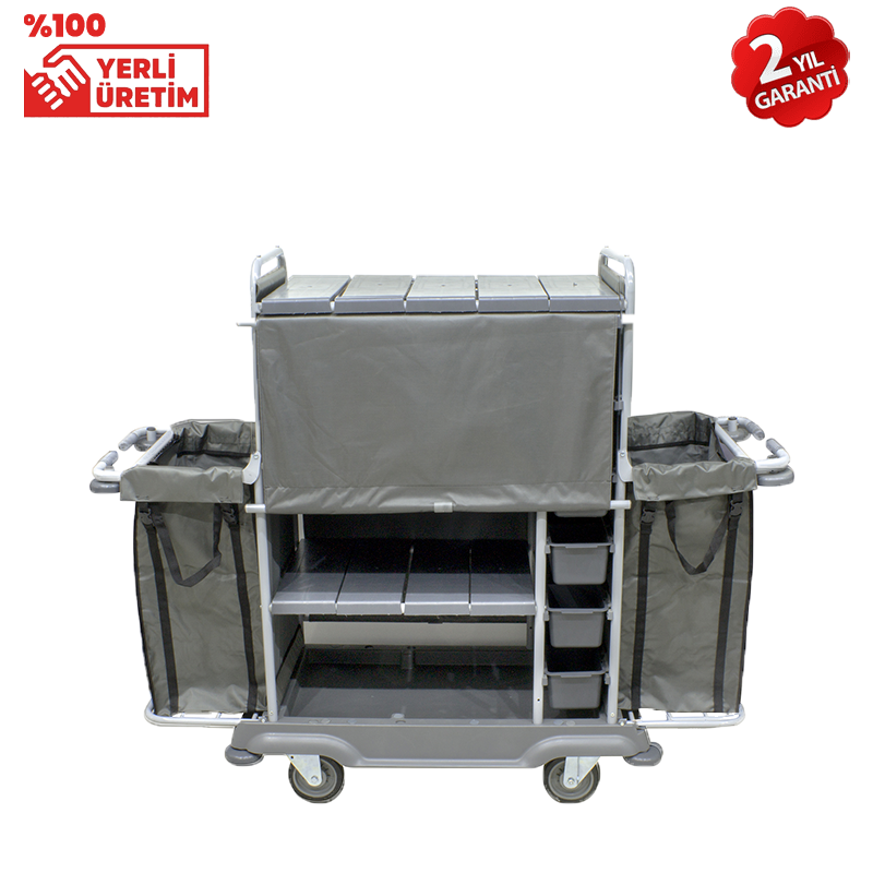 Büyük tekerlekleri, 5 adet iç çekmecesi, 2*100lt'lik kirli toplama torbası olan, etrafı firmamıza özel tasarımı ile derli toplu görünmesini sağlayan gerektiğinde kapatılabilen entegre örtüsü ve tekerlek sistemi sayesinde rahat kullanım sağlayan profesyonel kullanıcıların tercih sebebidir.