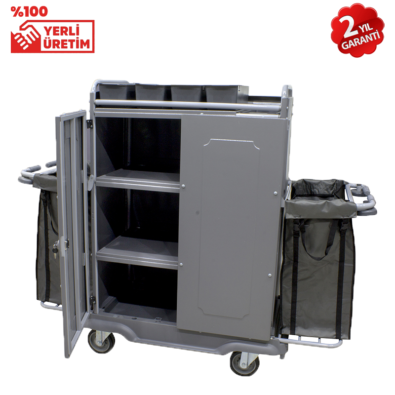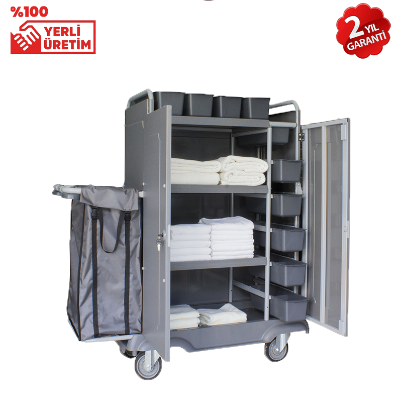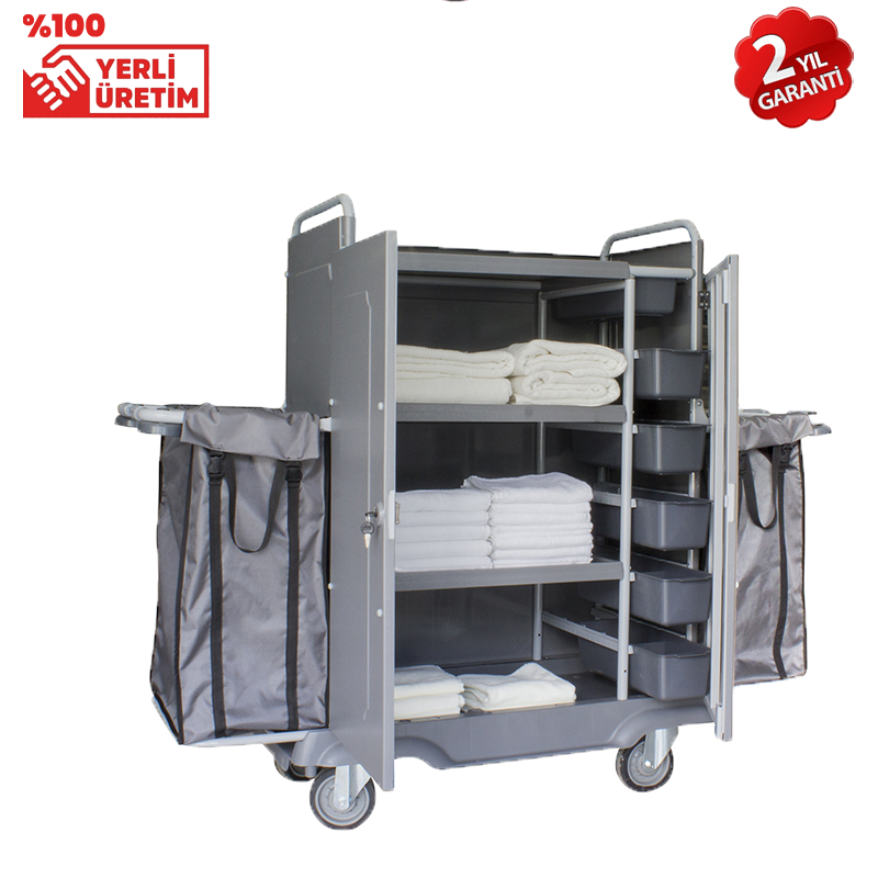Büyük tekerlekleri, 5 adet iç çekmecesi, 2*100lt'lik kirli toplama torbası olan, etrafı firmamıza özel tasarımı ile derli toplu görünmesini sağlayan gerektiğinde kapatılabilen entegre örtüsü ve tekerlek sistemi sayesinde rahat kullanım sağlayan profesyonel kullanıcıların tercih sebebidir.